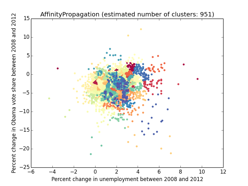 You can find many interesting and often sobering correlations in this plot – if you’re ever feeling too positive about the state of racial and socioeconomic equality in the US, a quick look at this chart should cure that. Anyway, we’d like to figure out which features are most strongly predictive of voting for Obama vs. Romney in a way that takes these correlations into account: in other words, if demographic features A and B are both strongly correlated with percentage of votes for Obama but also with each other, then it’s likely that the power of A in explaining voting trends is partially due to its correlation with B and vice versa. Thus, if we build a model for explaining voting trends and we include feature A, we wouldn’t have as much of a need for feature B anymore, because B wouldn’t add much predictive power to the model that is not already found in A. There are a bunch of different methods that we could use to get some idea of the ranking of the relative importance of the different features, and I’ll briefly discuss my attempts to use two of these methods to get a sense of which demographic features are most important. (Spoiler alert: both methods say that the same 3 or 4 features are most predictive of voting trends.)