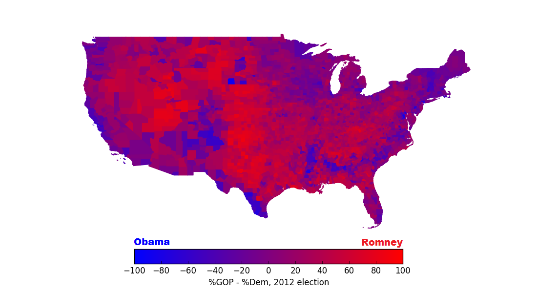 Counties in the contiguous United States, colored by the percent to which they voted for Romney over Obama or vice versa: for instance, a county in which Obama received 59% of the votes and Romney received 39% would be colored the shade of purple shown by “-20” on the color bar.
