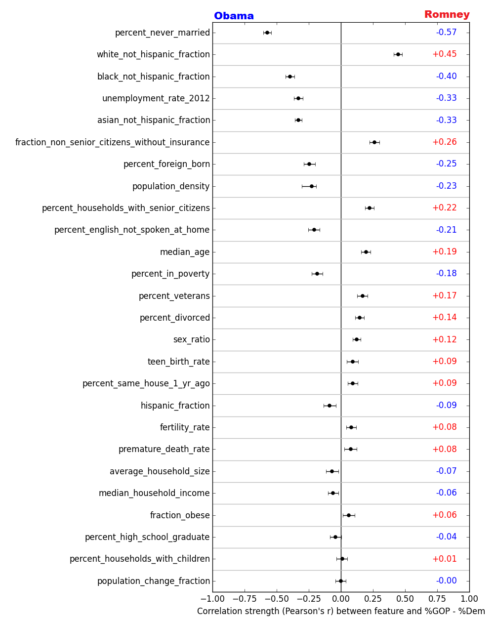 The further each point is to the left or the right of the center line, the more strongly correlated that feature is with how counties voted in 2012. I’ve ranked the features here by the strength of their correlation with voting trends: at the top, we see that the single demographic feature most strongly correlated with voting for Obama is the percentage of citizens in the county who have never been married. (This marriage-based partisan divide has been observed before, by the way.)