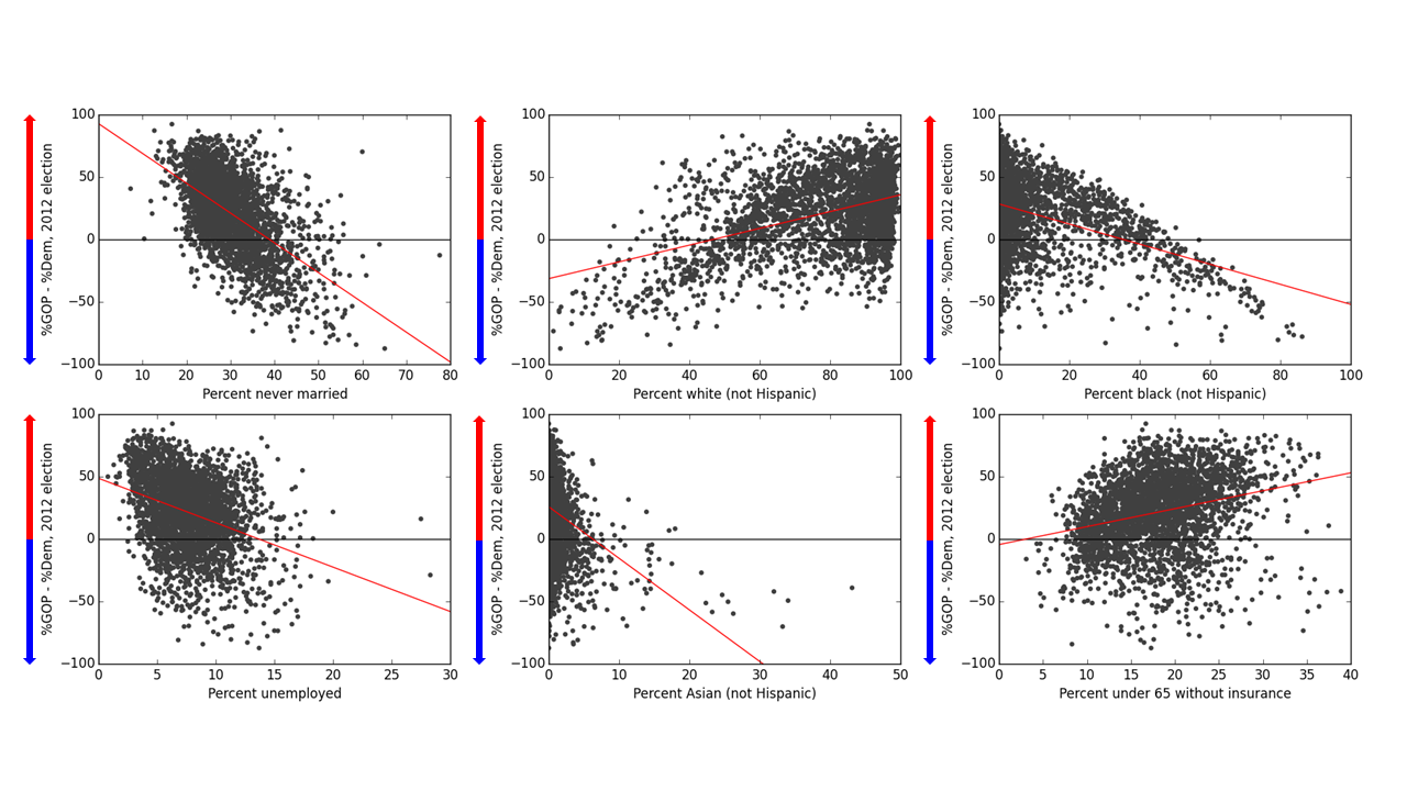 Difference in percentage of votes for Romney and Obama in the 2012 US presidential election, plotted against the six individually strongest demographic correlators, for single US counties. The higher the position along the y-axis, the higher the percentage share of votes was for Romney than for Obama. Red lines are attempts to fit lines to scatter plots via linear regression: in most cases these are clearly pretty poor fits to the observed distributions. (I mean, holy heteroscedasticity, Batman!)