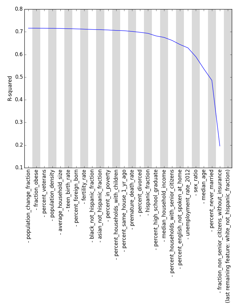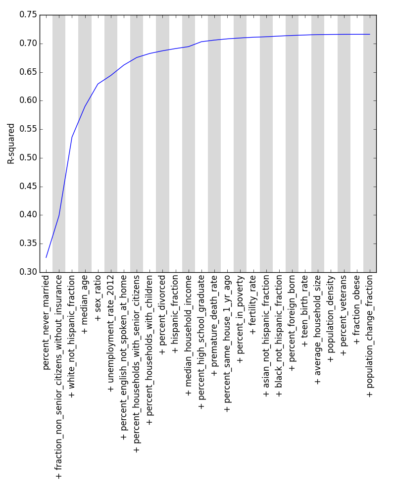 Here, we see that the most important pieces of demographic information in explaining voting trends are (1) the percentage of people in a county who have never been married, (2) the percentage of citizens under 65 without health insurance, and (3) the percentage of citizens who are white. (Reassuringly, performing a backward stepwise feature selection, in which features are progressively removed rather than added, lists these same three features as being most important, albeit in a different order.) We see that these top three features from our stepwise feature selection (the second and third columns of the table below) are different than the top three features that have the strongest correlation with voting trends on their own (first column): this serves to show how much correlated features can skew our result.